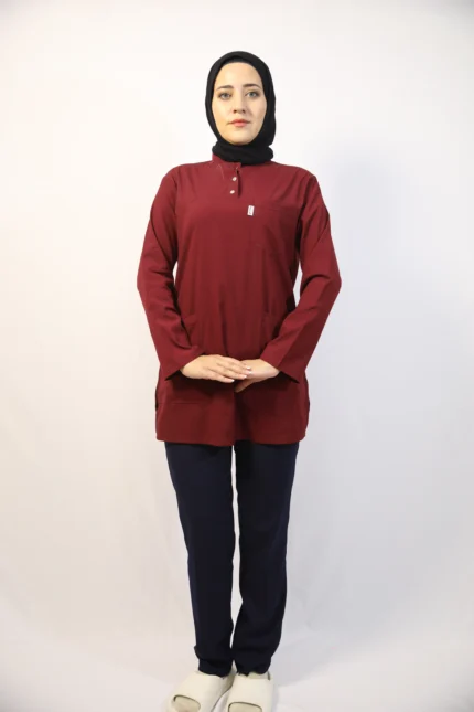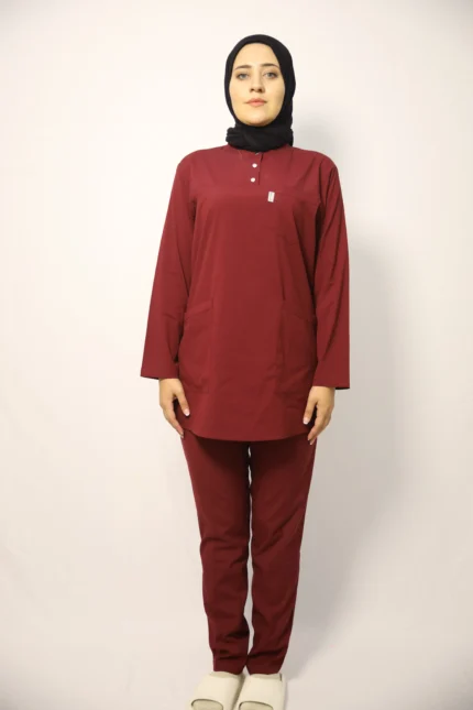 Tesettür Bordo Soft Likralı Hemşire ve Doktor Forması Takımı Hastane Üniforması